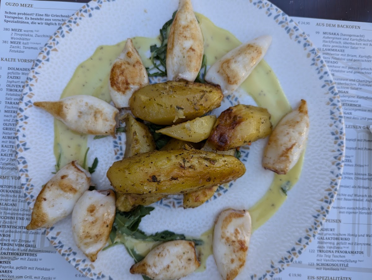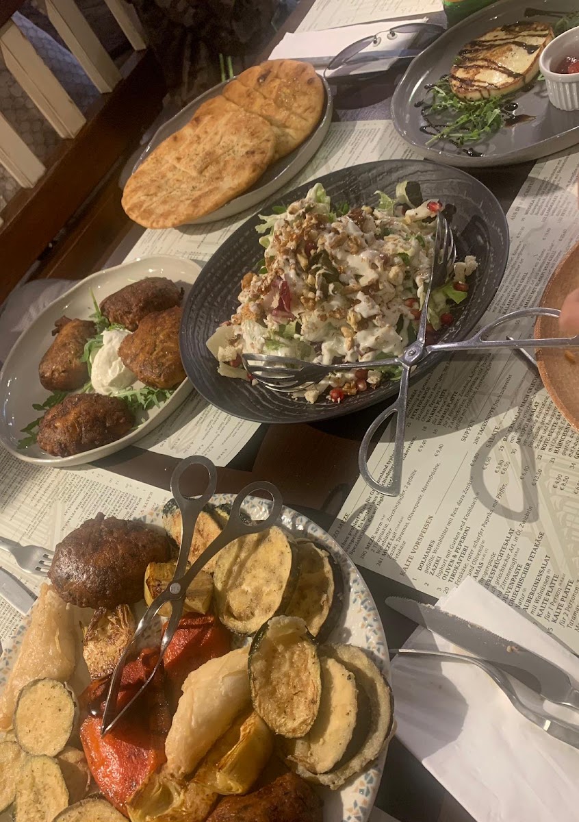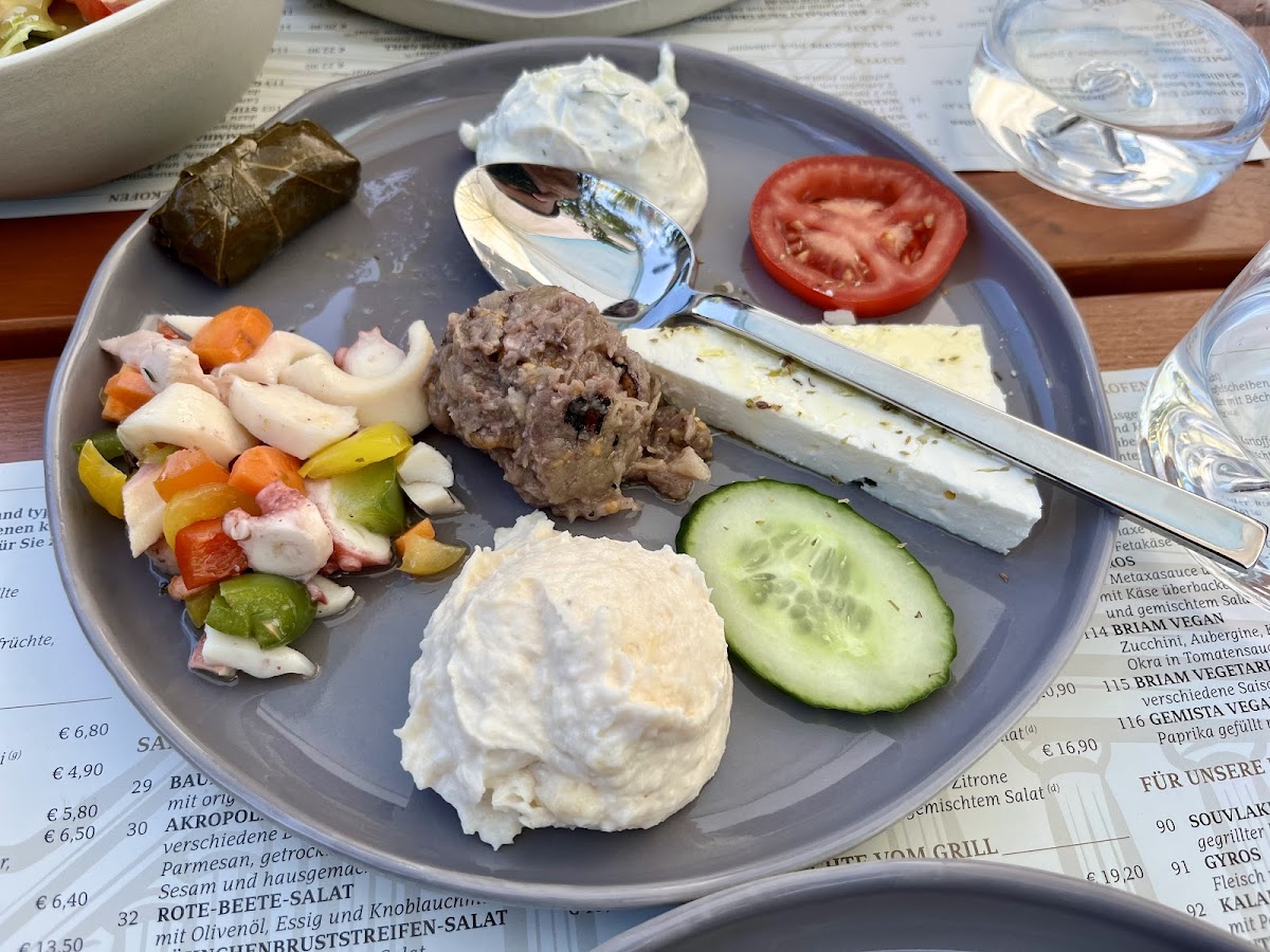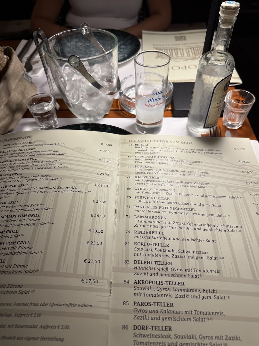 The main courses include a variety of grilled and hearty dishes, with the Akropolis-teller standing out as a signature option. This dish brings a variety of Mediterranean flavors together, making it a perfect choice for those seeking something rich and filling. For seafood lovers, the Octopus is a must-try, showcasing tender and perfectly grilled seafood. Another seafood option, the Doradenfilet Vom Grill, features a beautifully grilled fish fillet that’s light yet satisfying.