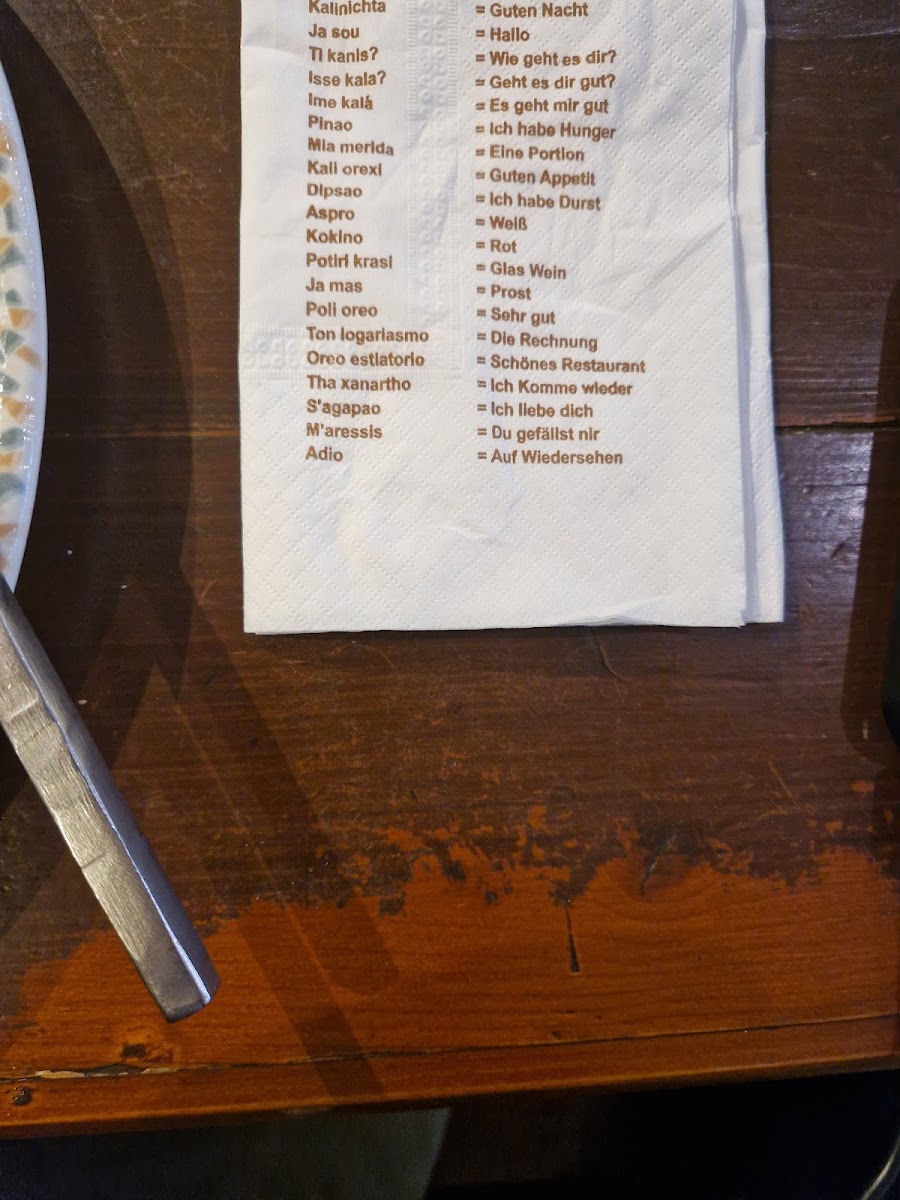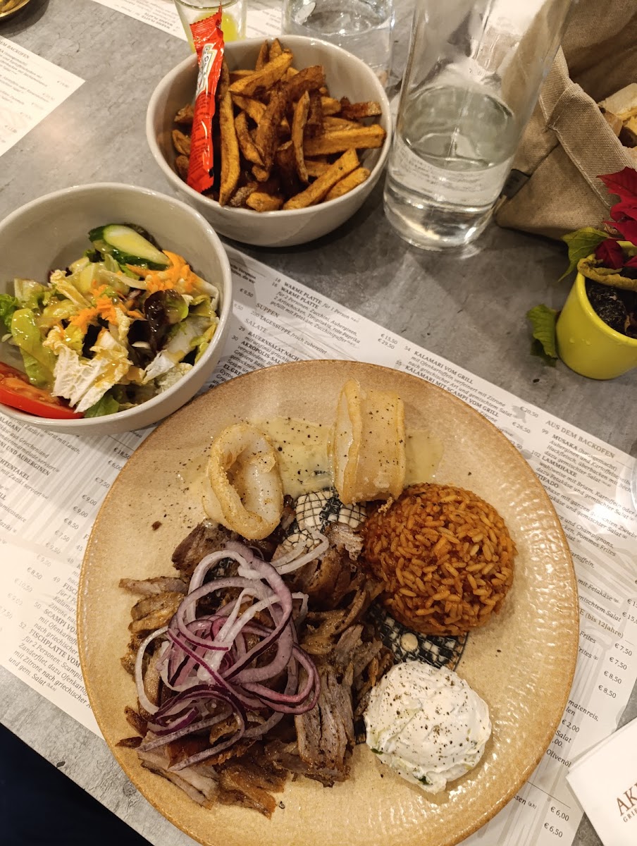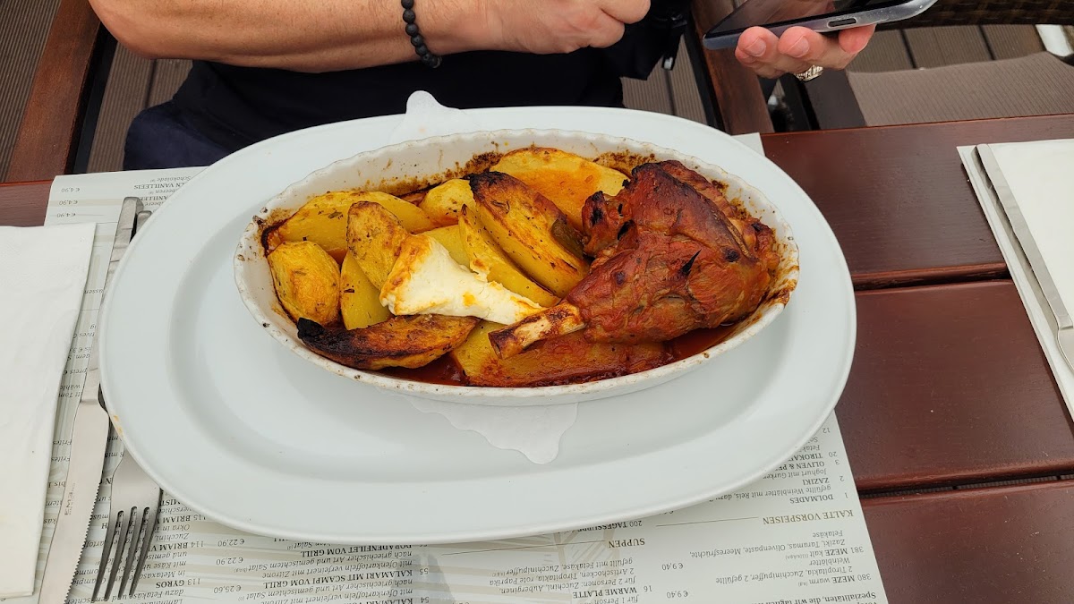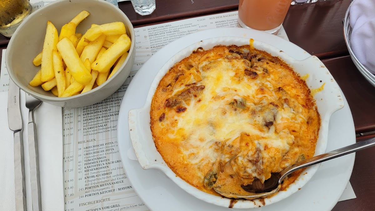 For a more traditional Greek experience, the Stifado offers a rich, stewed meat dish, while the Gyros In Metaxasauce and Gyros Aus Dem Ofen are excellent choices for those wanting a hearty serving of seasoned meat. The Gyros In Metaxasauce comes with a unique, flavorful sauce, whereas the oven-baked version of Gyros Aus Dem Ofen gives a different texture and depth of flavor.